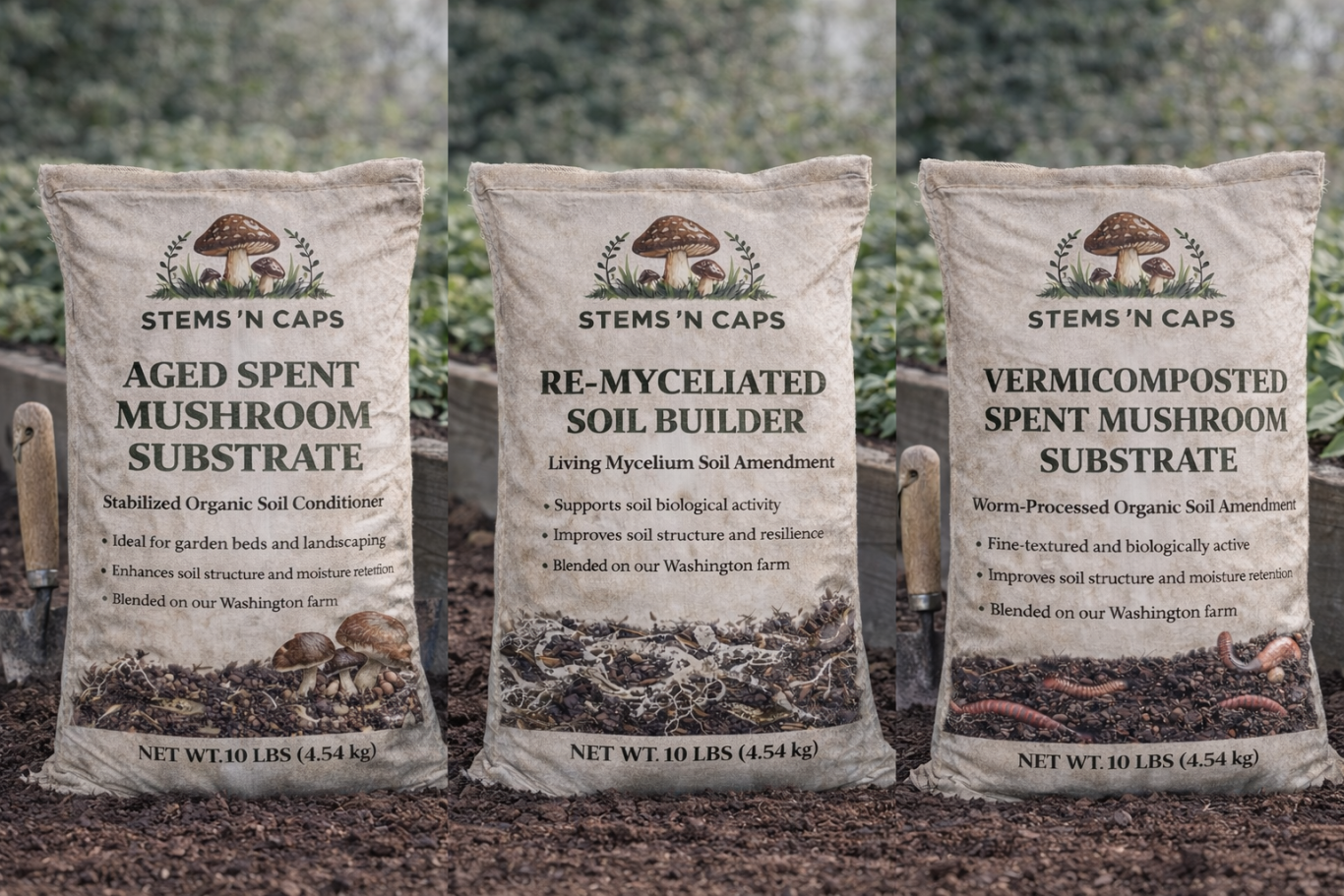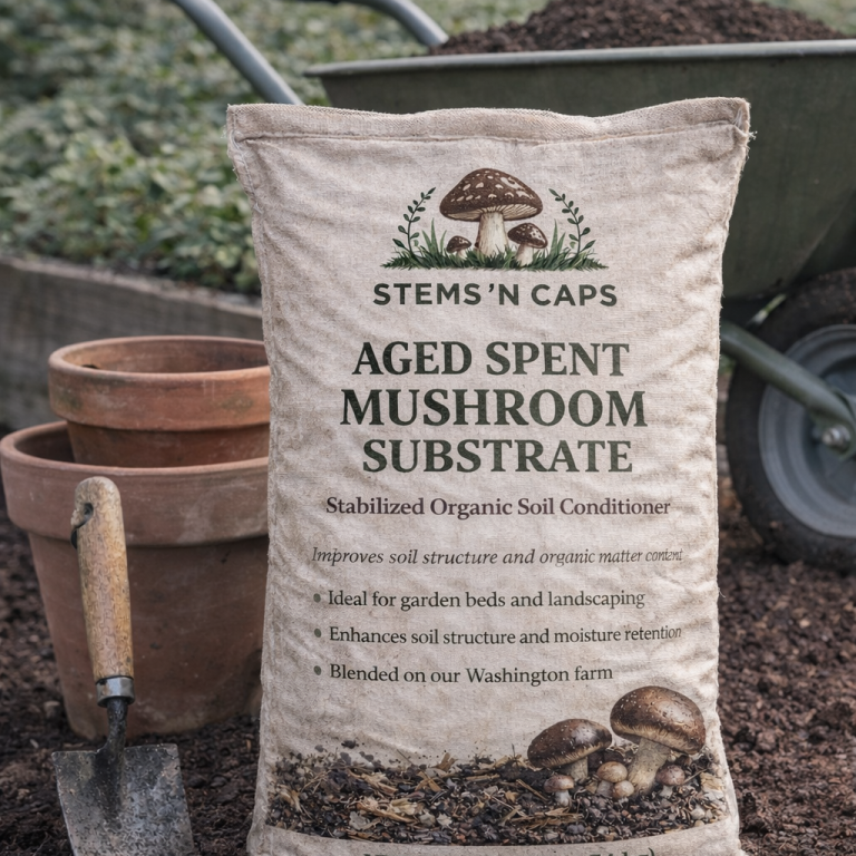 Stems ’n Caps soil amendments are made from spent mushroom substrate (SMS) generated during our gourmet mushroom production. Instead of treating it as waste, we transform it into a biologically active soil-building material that improves structure, nutrient cycling, and microbial life.